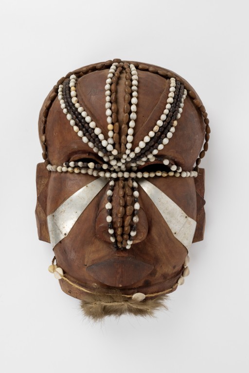 Maska izdelana iz enega kosa lesa. Sprednji del je okrašen z belimi in rjavimi semeni, na ličnice sta pritrjena trikotna kosa pločevine. Brada maske je okrašena z živalskim krznom in s školjkami kavri.