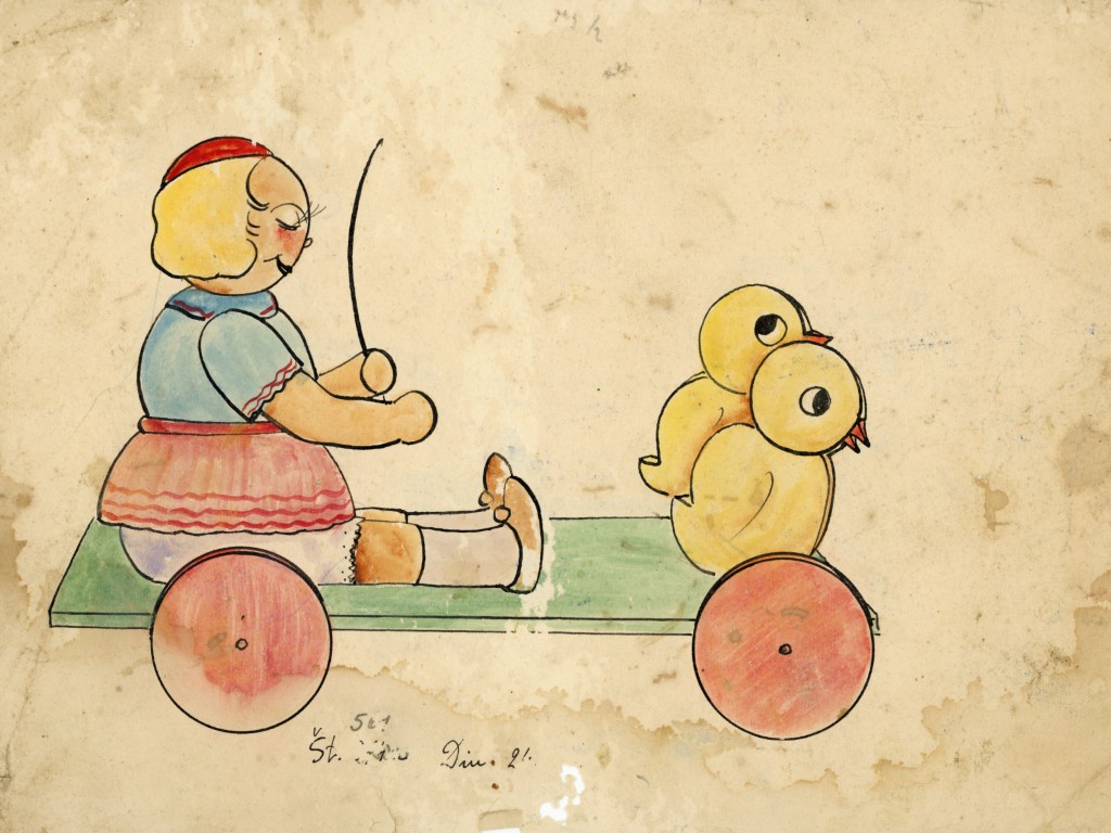 Risba prikazuje deklico s svetlimi lasmi, ki sedi na vozičku. Oblečena je v modro bluzo, rožnato krilo z belimi čipkastimi robovi in rdečo kapico. Deklica v rokah drži tanko palico, pred njo pa sta na podstavek pritrjena dva rumena piščančka z rdečimi kljuni. Celotna figura je postavljena na zelen podstavek s štirimi rdečimi kolesi. Motiv je narisan s tehniko risanja s tušem za poudarjene zunanje linije in obrazne detajle, barvne ploskve pa so zapolnjene s tehniko akvarela. Na spodnjem delu lista je ročno zapisan napis: »561 Št. ~~375~~ Din 24.–«. Prvotna kataloška številka prečrtana in nadomeščena z novo (561), cena je 24 dinarjev. Papir je močno porumenel, z vidnimi rjavimi madeži vlage in sledmi umazanije. Ilustracija je služila kot predloga za obrtno izdelavo lesenih igrač. Ilustracija je najverjetneje nastala v delavnici "Umetnostno lesna obrt in žgano slikarstvo Milan Horvat", kjer so med drugimi izdelovali tudi igrače.
