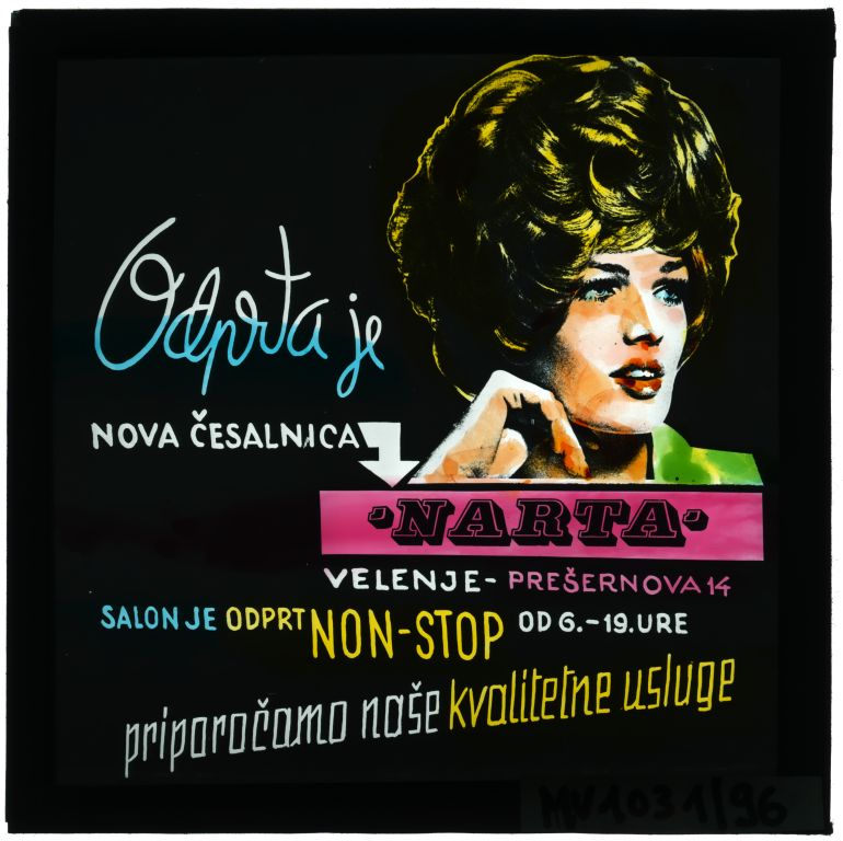 Steklena reklamna ploščica oziroma diapozitiv so v preteklosti uporabljali za oglaševanje v kinih, pred začetkom filmskih predstav. Oglas na črni podlagi s tipično retro estetiko napoveduje odprtje nove česalnice z imenom Narta, ki se je nahajala na Prešernovi ulici 14 v Velenju. Osrednji vizualni element je barvna ilustracija ženske z modno in bujno pričesko, ki jo dopolnjujejo raznobarvni napisi v različnih tipografijah, od rokopisnih do krepkih tiskanih črk. Reklama poudarja, da je salon odprt neprekinjeno od 6. do 19. ure, in vabi stranke k uporabi njihovih kvalitetnih uslug, s čimer predstavlja dragocen dokument lokalne obrtne zgodovine in takratnega načina vizualnega komuniciranja v Velenju.