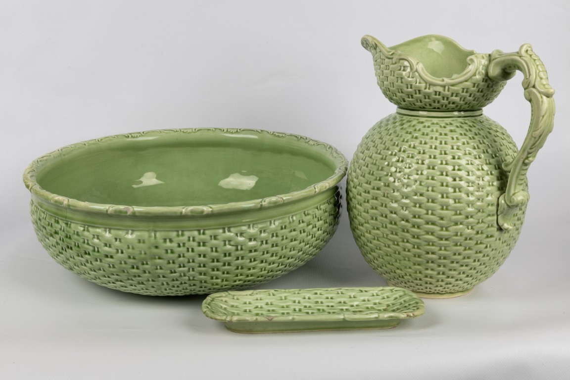 Komplet za umivanje sestavljajo skleda (lavor), vrč in krožnik za milo, izdelani v koncu 19. stoletja. Keramični komplet v nežno zeleni barvi s prepoznavnim reliefnim vzorcem pletene košare je dragoceno poročno darilo, ki ga je od svoje mame prejela Angela, babica darovalke, ko je še živela na Dunaju. Ob selitvi v Velenje je Angela dragoceni set prinesla s seboj, kasneje pa ga je podedovala njena vnukinja Marija Krajnc (rojena leta 1936 v Šoštanju), ki je predmet tudi podarila za muzejsko zbirko. Komplet s svojo svetlečo glazuro in bogato okrašenim ročajem vrča predstavlja čudovit primer meščanske kulture bivanja in osebne higiene tistega časa.