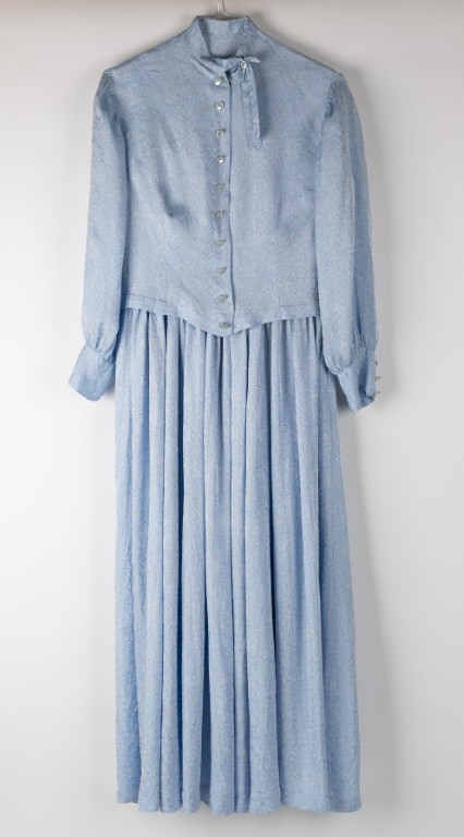 Na fotografiji je poročna obleka Marije Glinšek (roj. Štramcar) iz leta 1958, ki ga sestavljajo dolga modra obleka brez rokavov, vrhnja bluza in bombažno podkrilo. Gre za elegantno, svetlo modro obleko iz svilenega damasta z diskretnim cvetličnim vzorcem, ki odstopa od klasične bele barve, kar je bila v tistem času pogosta in praktična izbira. Obleka in bluza imata cvetlični vzorec, bluzo pa krasijo še elegantna pentlja pri ovratniku in beli biserni gumbi na zapestjih. Obleka je bila ročno krojena in šivana po meri za poroko v Šoštanju, posebno vrednost pa ji dodaja skrito belo podkrilo z ročno vezeno obrobo. Izbor barve in materiala namesto klasične bele barve odraža prefinjen meščanski slog in praktično eleganco petdesetih let prejšnjega stoletja.