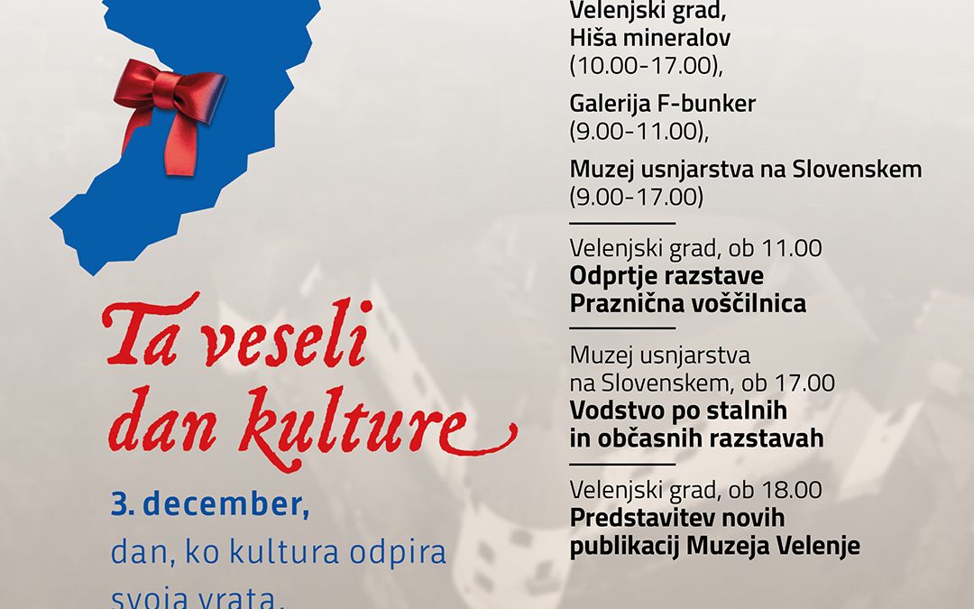V sredo, 3. decembra, Muzej Velenje pripravlja dan odprtih vrat ob Ta veselem dnevu kulture: brezplačen ogled stalnih in občasnih razstav muzeja na Velenjskem gradu ter razstave Hiše mineralov (10.00–17.00), Galerije F-bunker (9.00–11.00) in Muzeja usnjarstva na Slovenskem v Šoštanju (9.00–17.00).